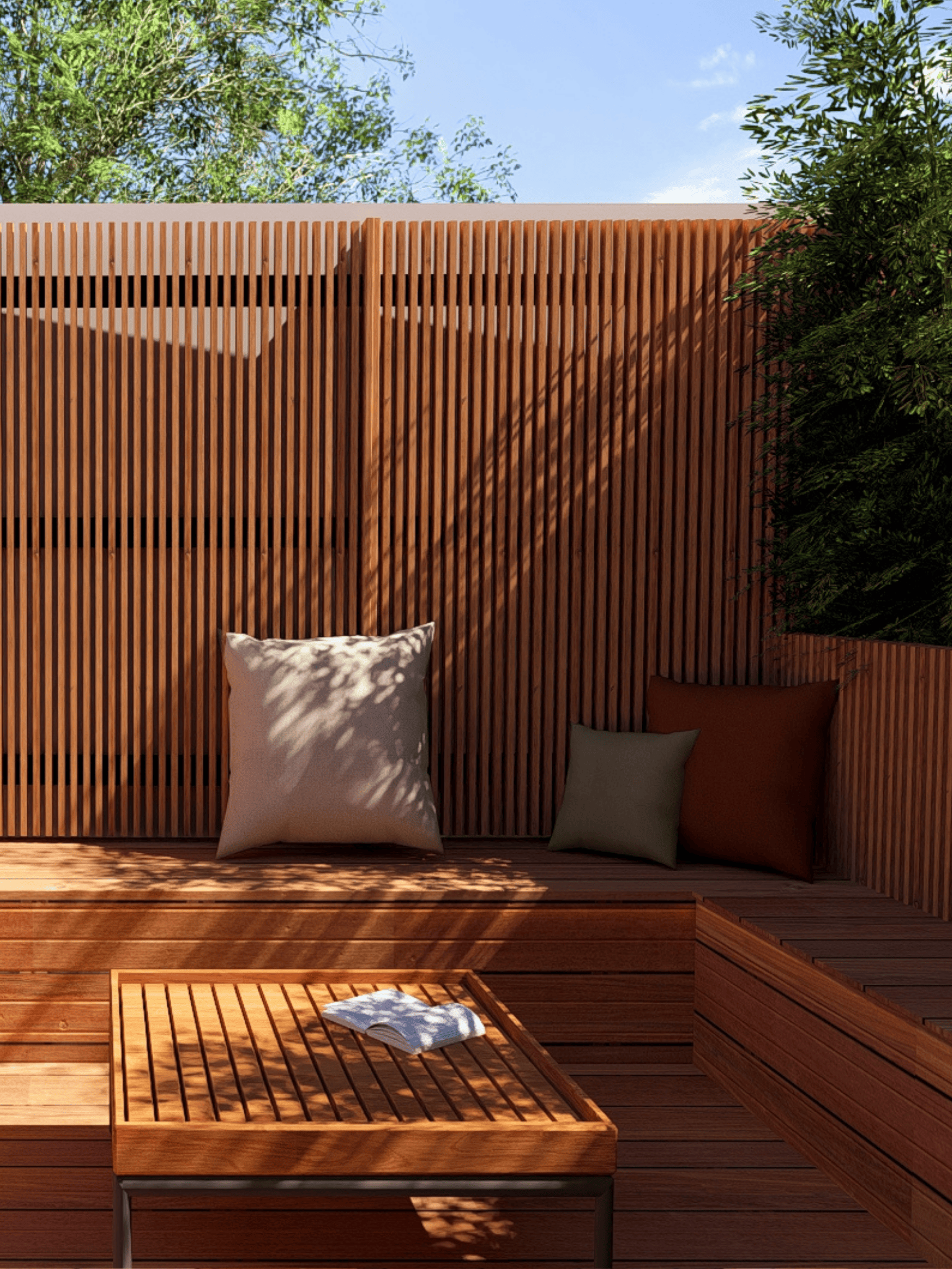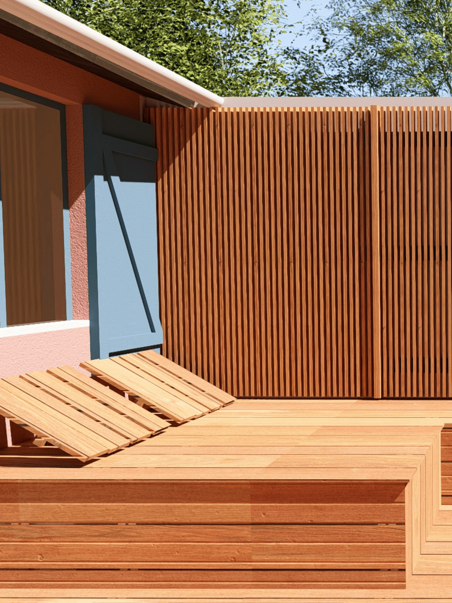Le cœur du projet repose sur la création d’une terrasse en ipé, un bois exotique apprécié pour sa durabilité, sa résistance naturelle aux intempéries et sa teinte chaleureuse. Ce matériau noble confère immédiatement une dimension haut de gamme à l’espace.