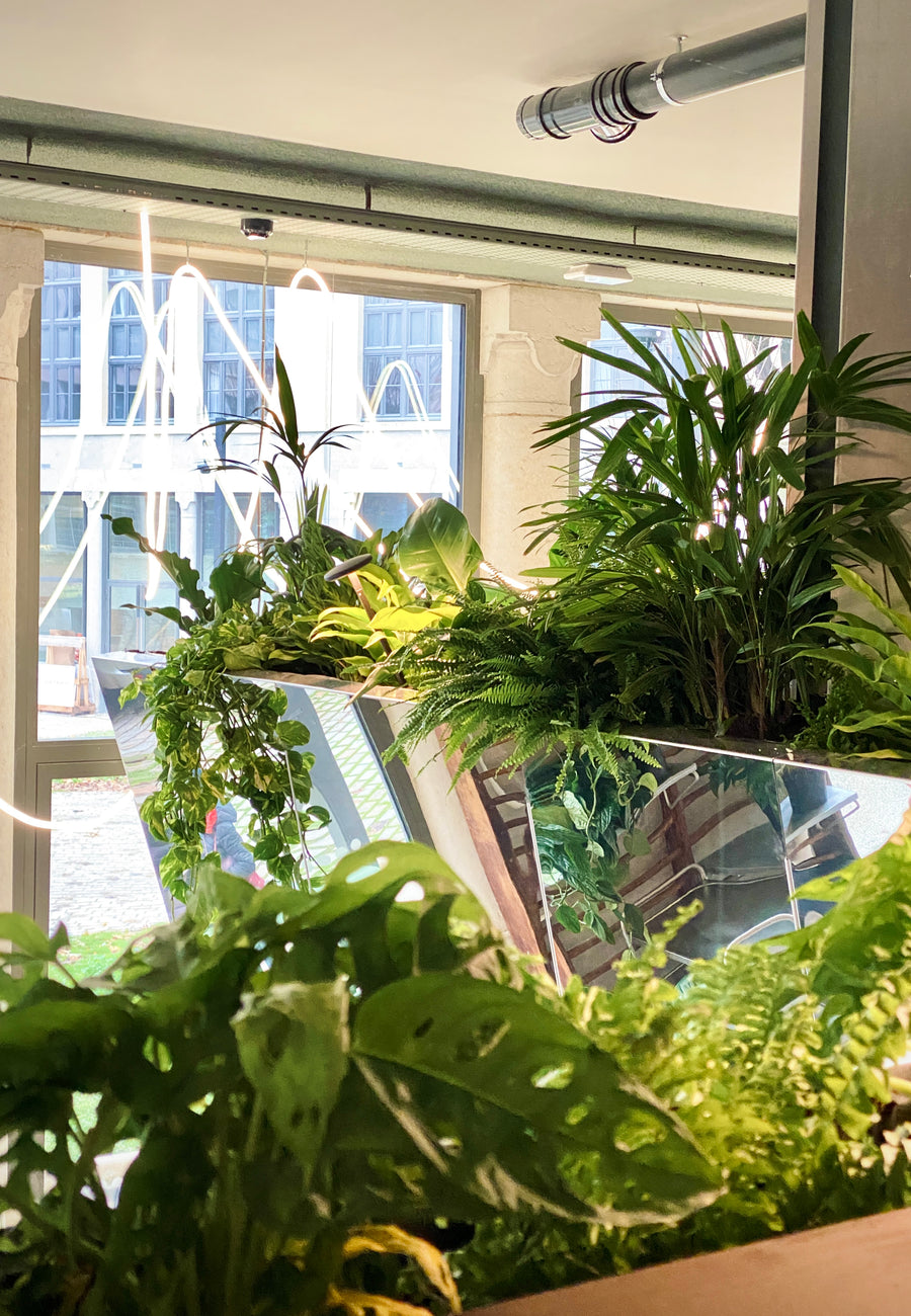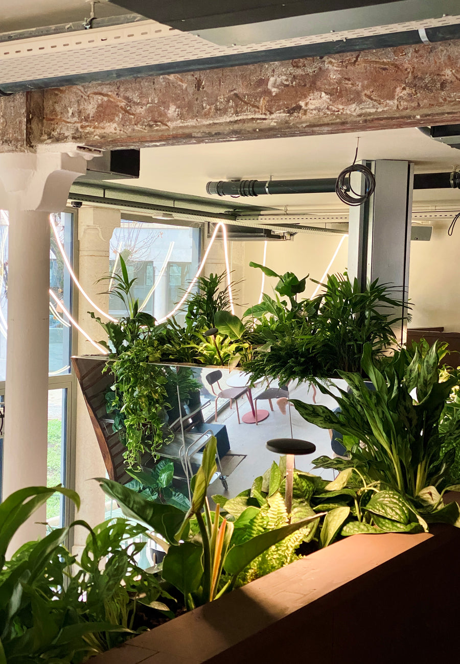 POUSSE a relevé le défi en installant plus de 200 plantes soigneusement sélectionnées. Le point d’orgue : un garde-corps végétalisé de 35 mètres de long, véritable jardin suspendu qui enveloppe le lieu d’une atmosphère apaisante et organique.