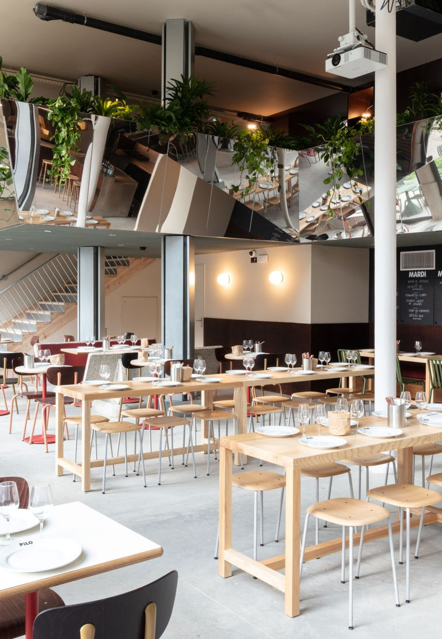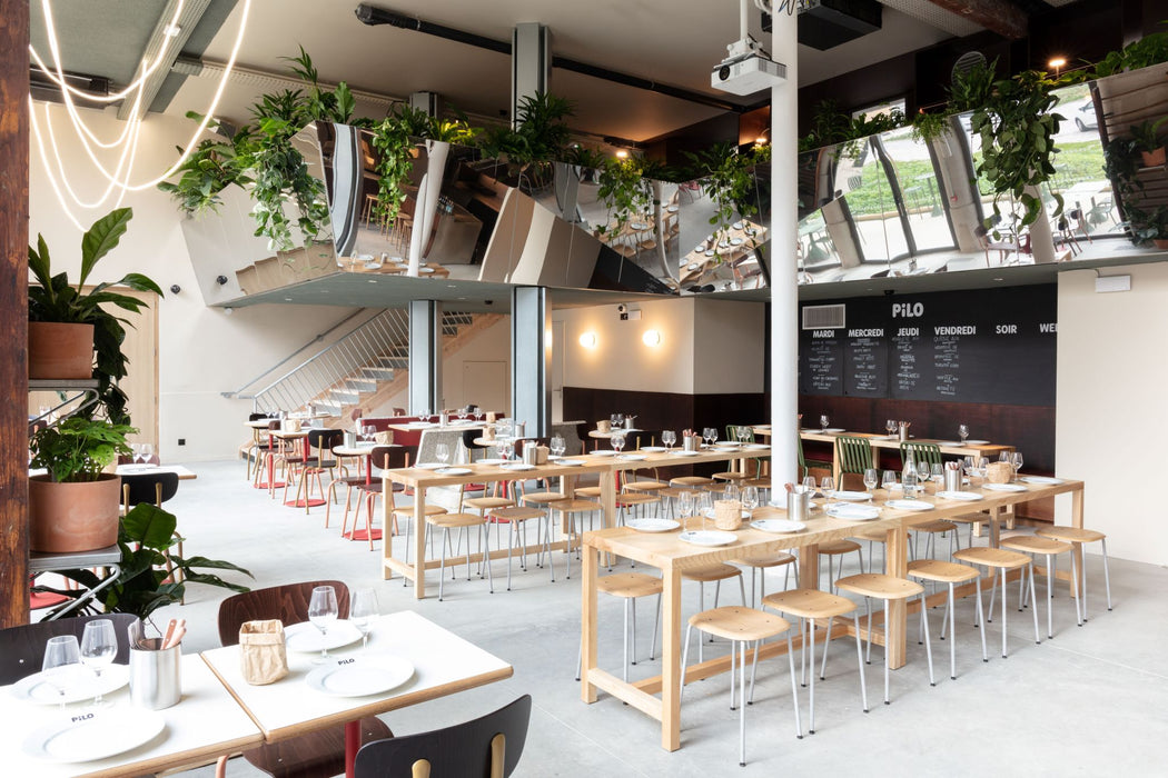 La lumière naturelle et les jeux d’ombres participent à l’ambiance chaleureuse du lieu. Côté salle de restauration, les grandes baies vitrées ouvrent sur le jardin, baignant l’espace de lumière. Sur la mezzanine, une atmosphère plus intime s’installe, avec un petit jardin suspendu pour une parenthèse végétale en hauteur.