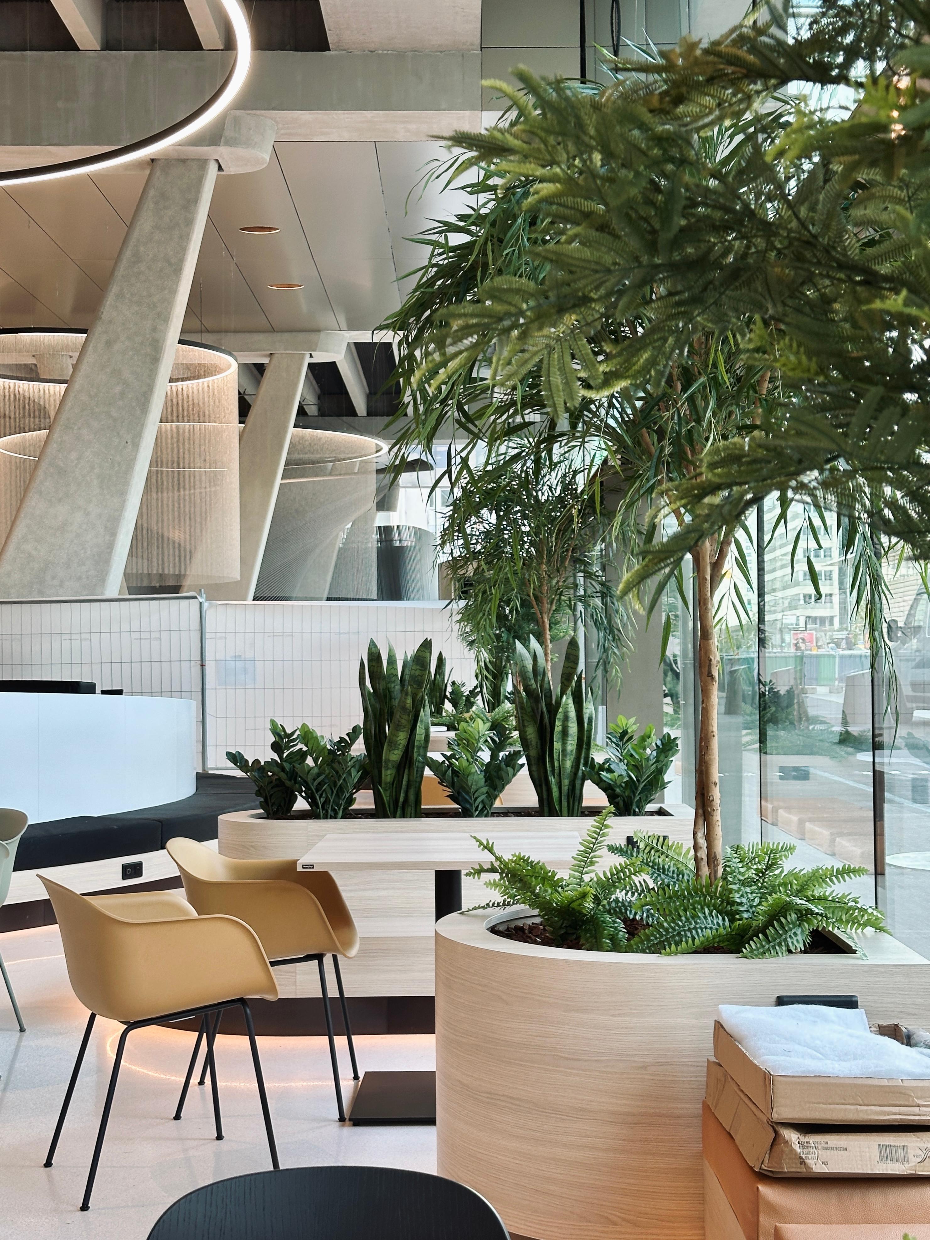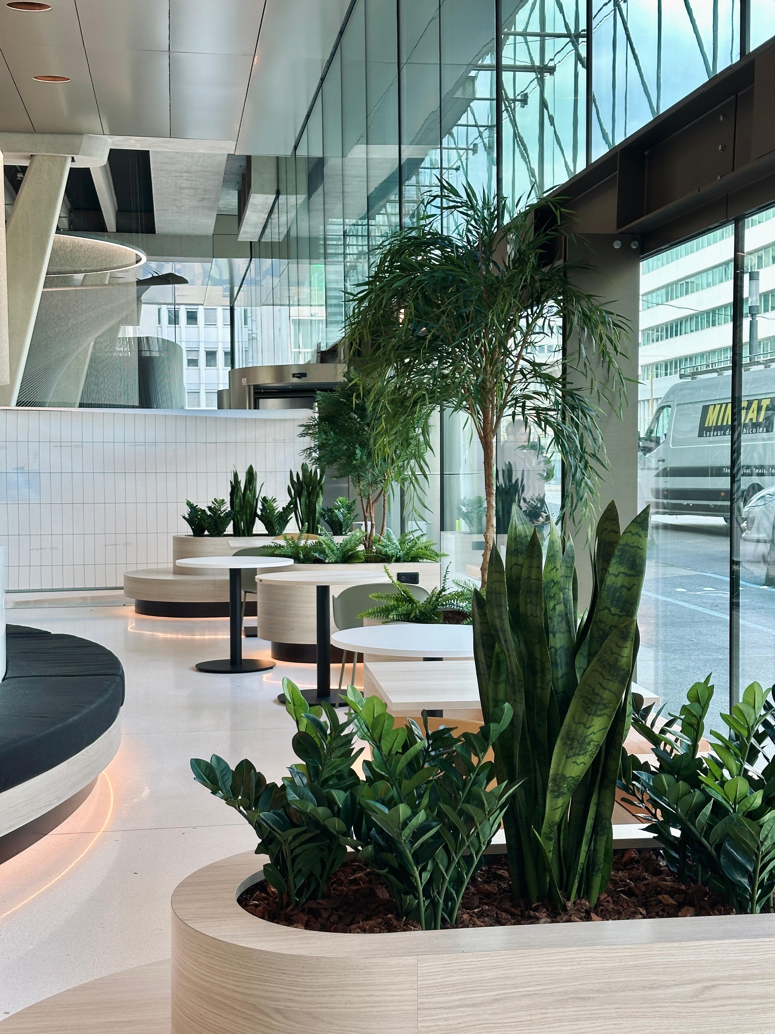 Les jardinières intégrées au mobilier existant ont été utilisées comme points d’ancrage. Le végétal vient ainsi s’inscrire dans la continuité de l’architecture contemporaine du hall, renforçant son identité tout en adoucissant son atmosphère.