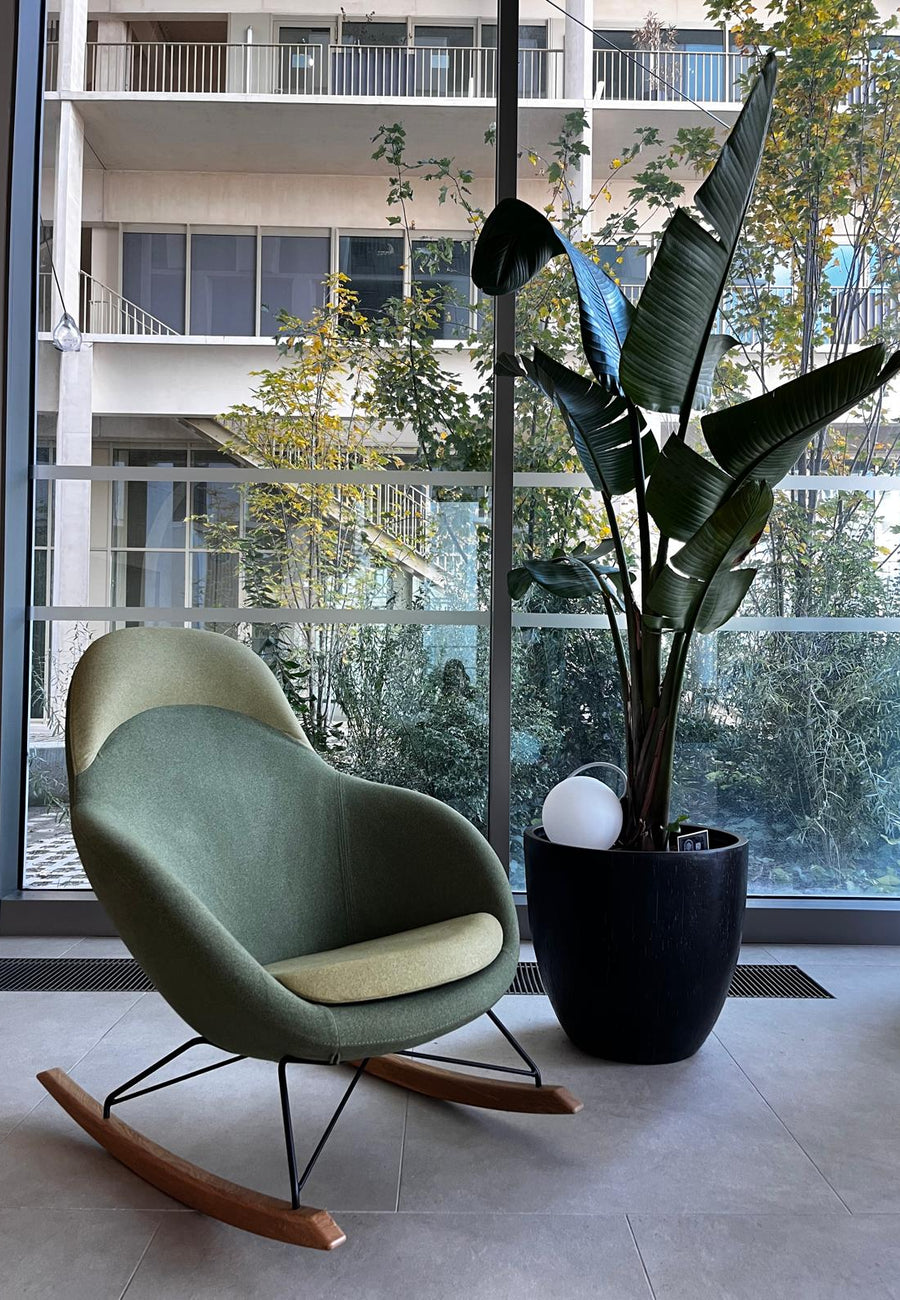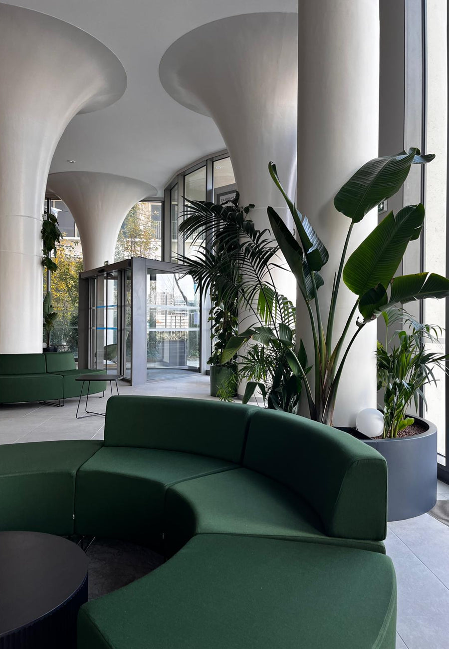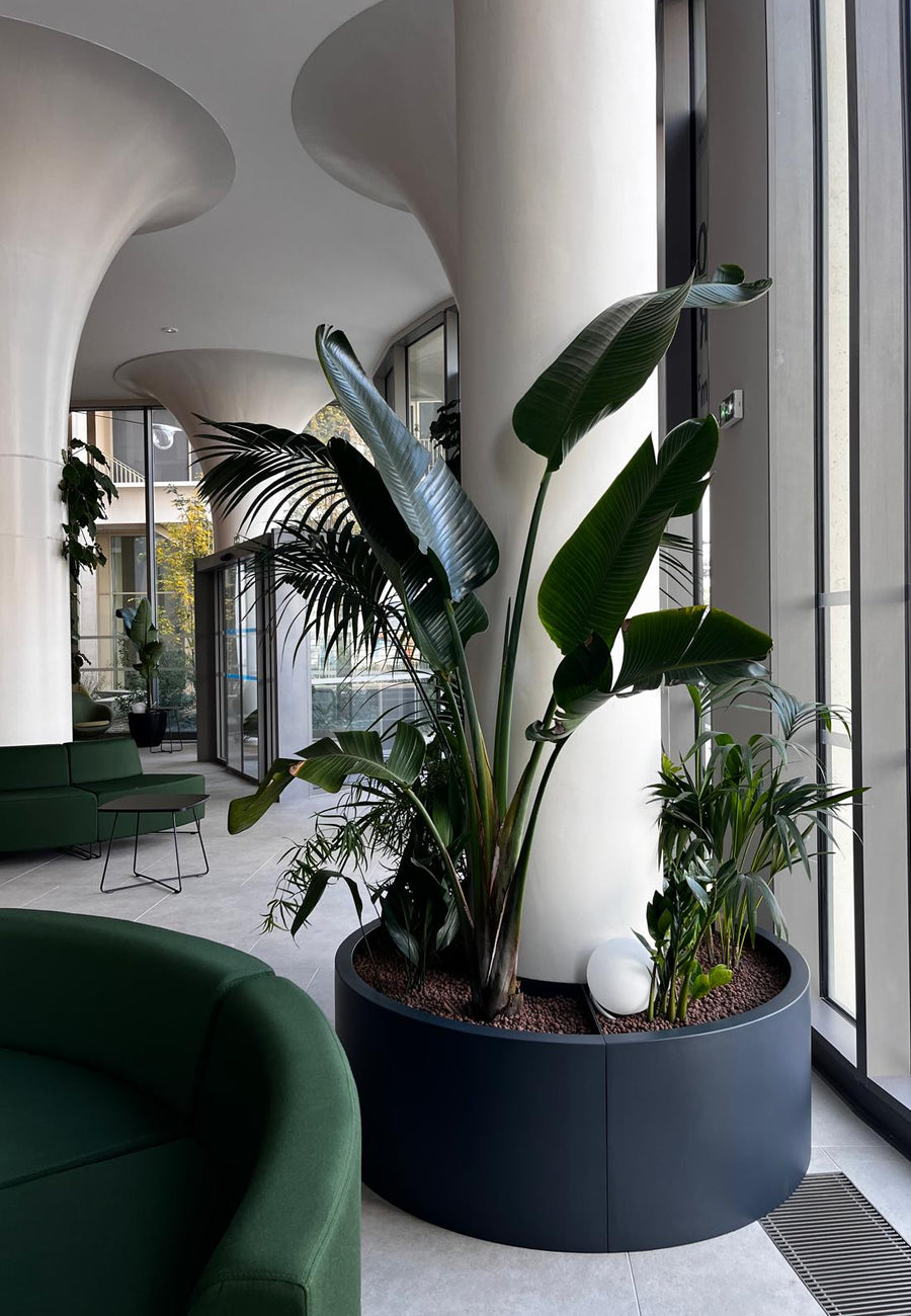 Pour cela, l’équipe a installé des jardinières rondes conçues sur-mesure et intégrées autour des colonnes structurelles, afin de créer une harmonie entre végétal et architecture.