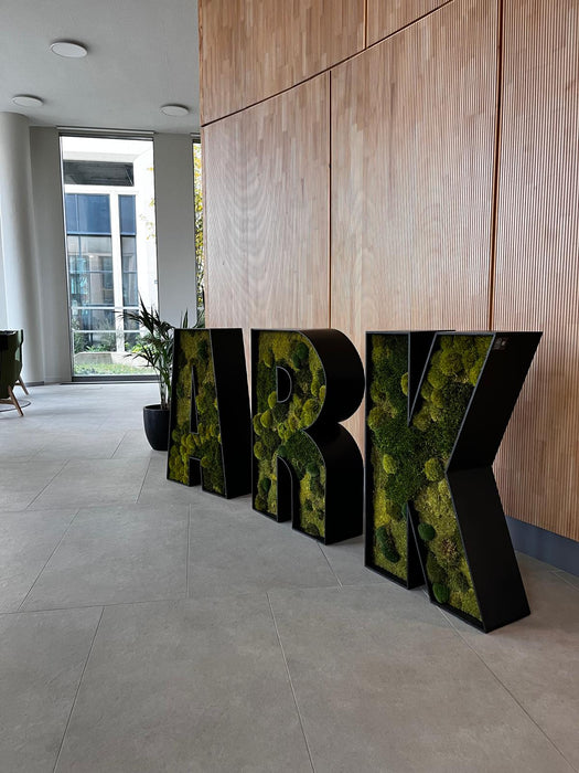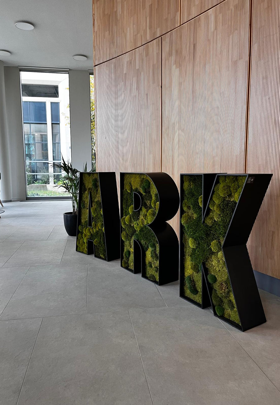 Enfin, point d’orgue du projet, un lettrage végétalisé monumental a été placé au fond du hall, affirmant l’identité du lieu et offrant un repère visuel fort dès l’entrée.
