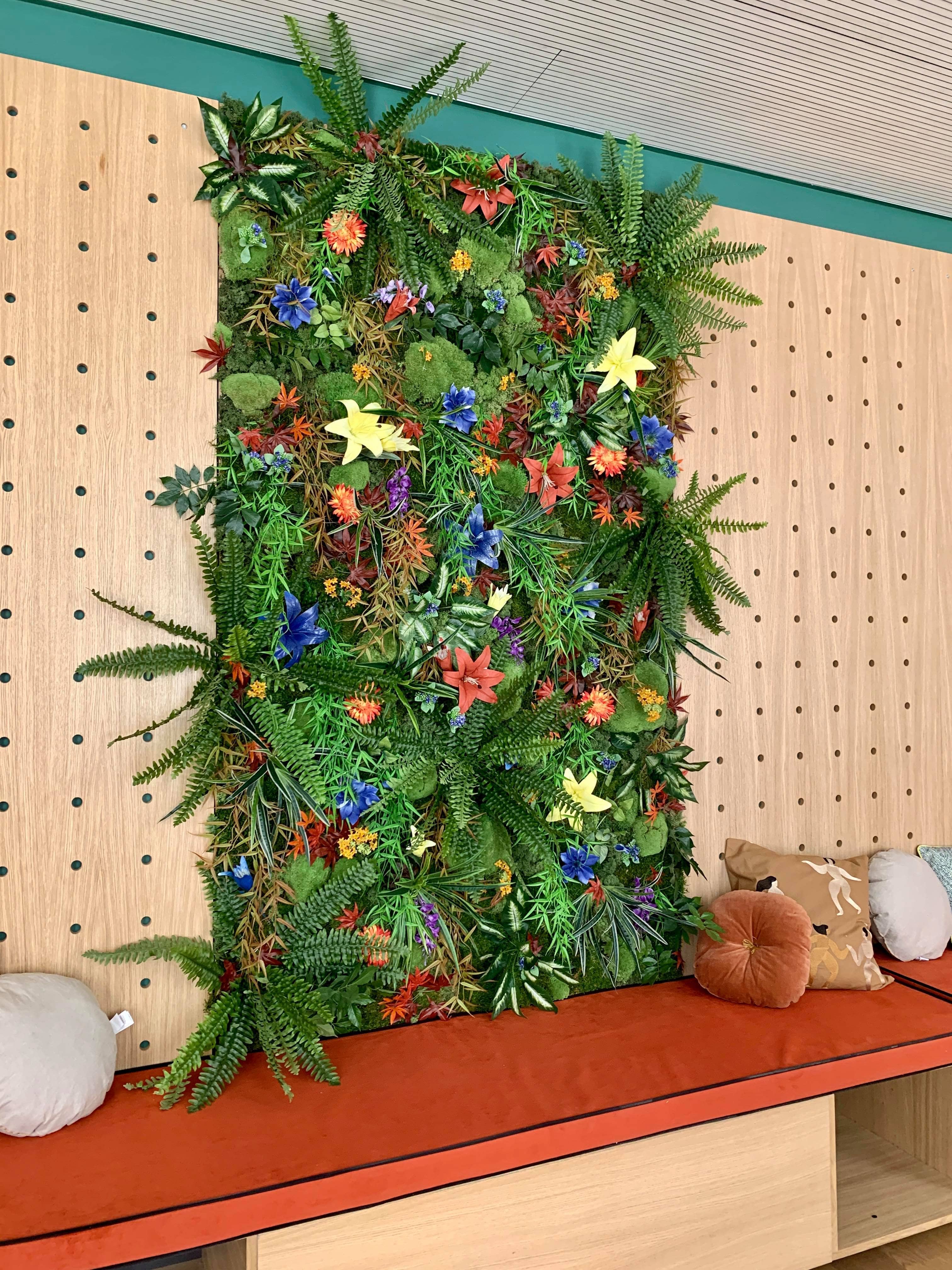 La palette végétale, riche et colorée, mêle fougères, mousses, tillandsias et feuillages exotiques, rehaussés de touches florales vives. Ce choix assure un impact visuel immédiat, sans entretien, idéal pour un espace à usage intensif.