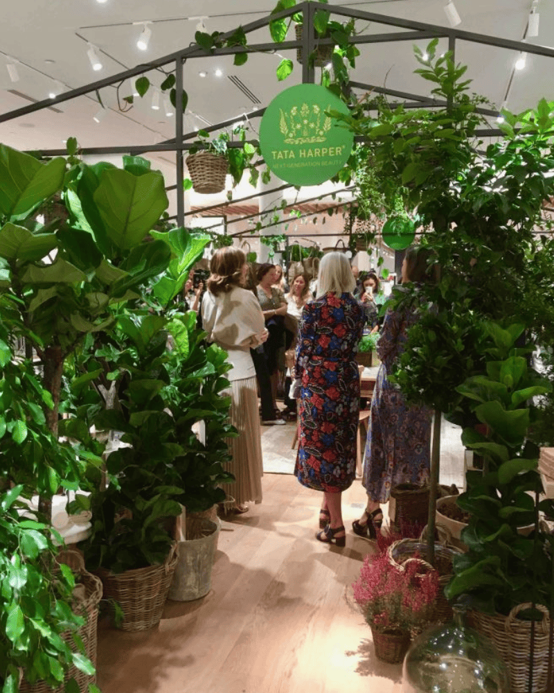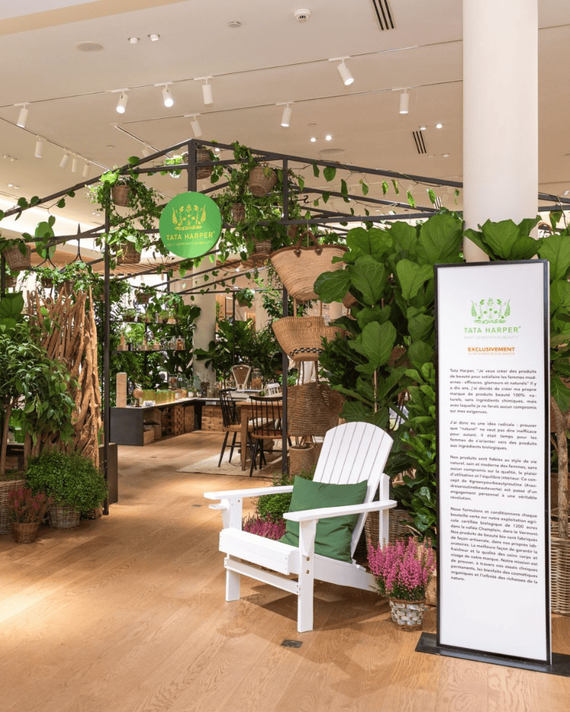 Dans ce lieu où les marques se confondent, Tata Harper, marque de luxe dans la cosmétique propose une invitation dans un univers apaisant et bio.