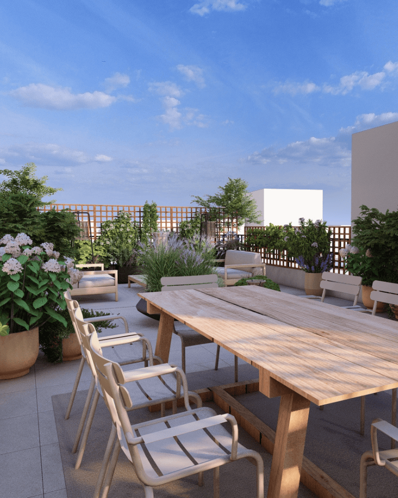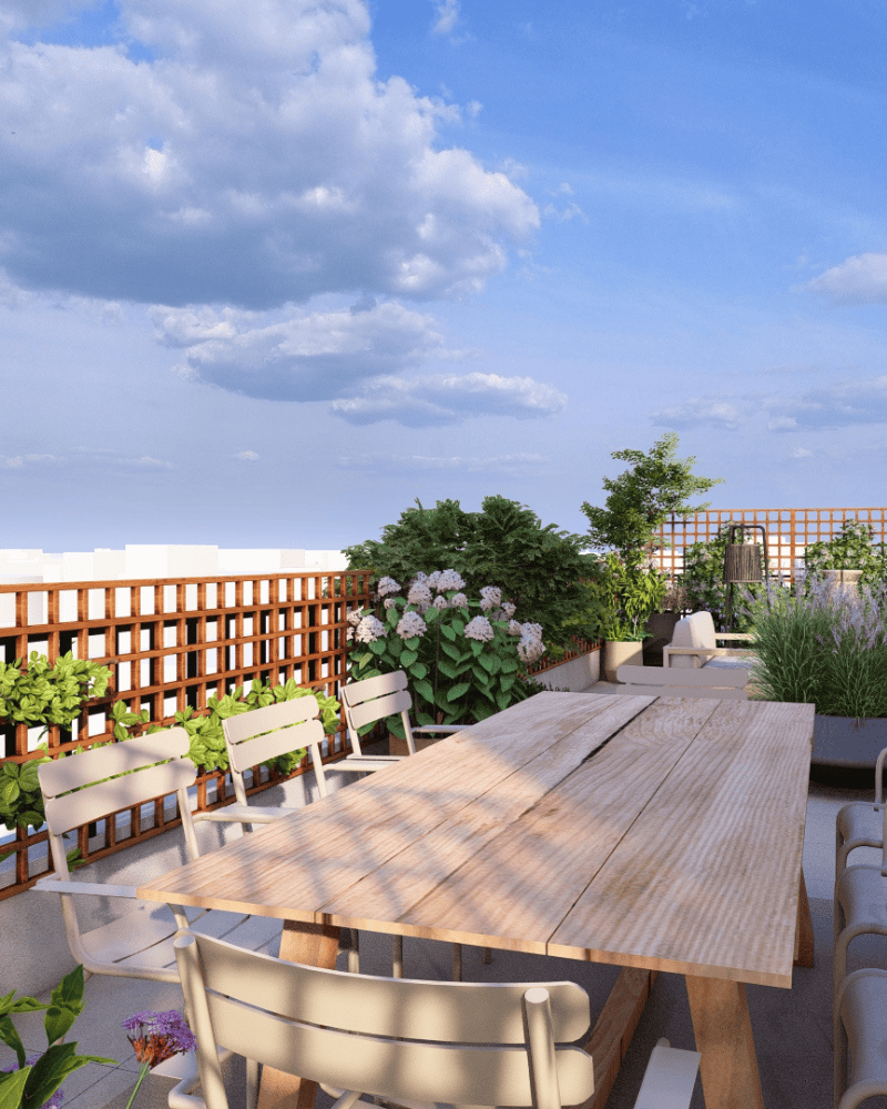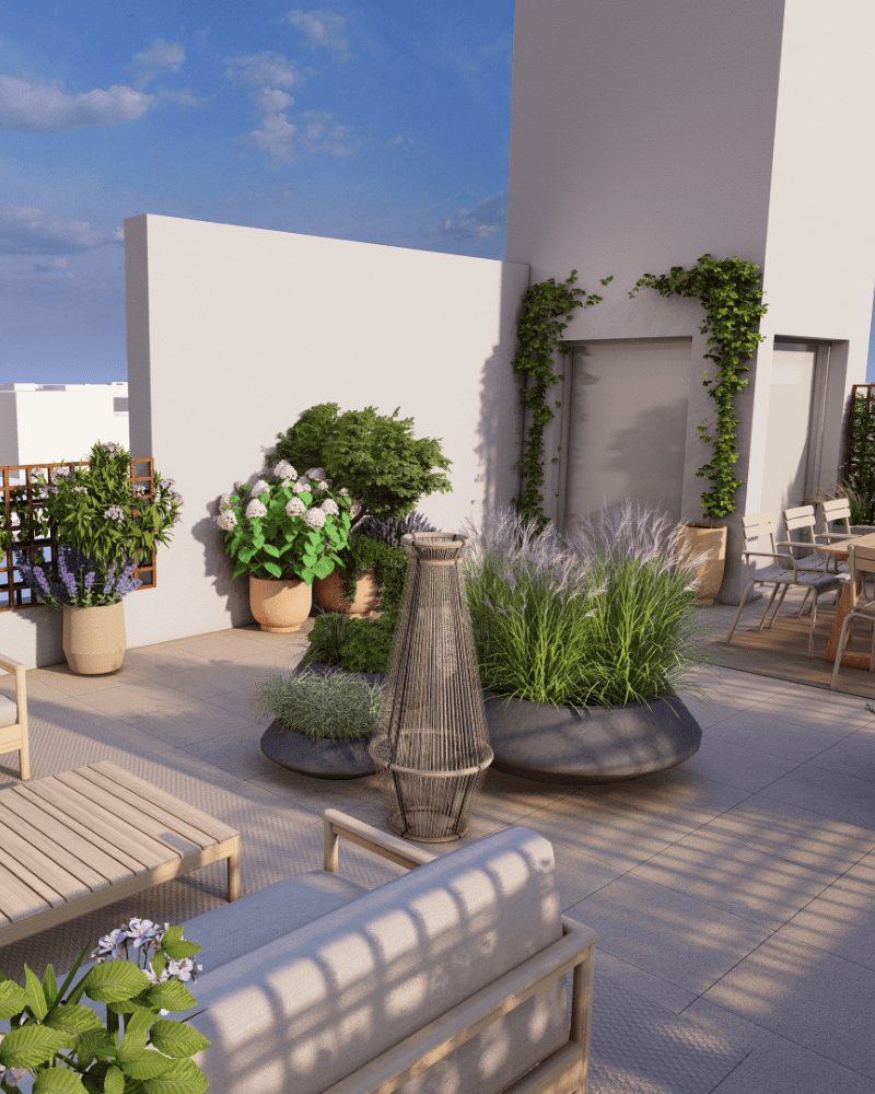 Deux espaces se distinguent : l’espace salon et l'espace dinatoire, qui s'articulent autour d’un îlot végétal.