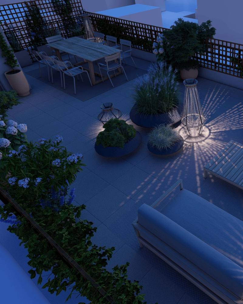 La nuit tombant, les jeux d’ombres projetés par les lumières prennent le relais et font de cette terrasse un espace dont on profite de jour comme de nuit.