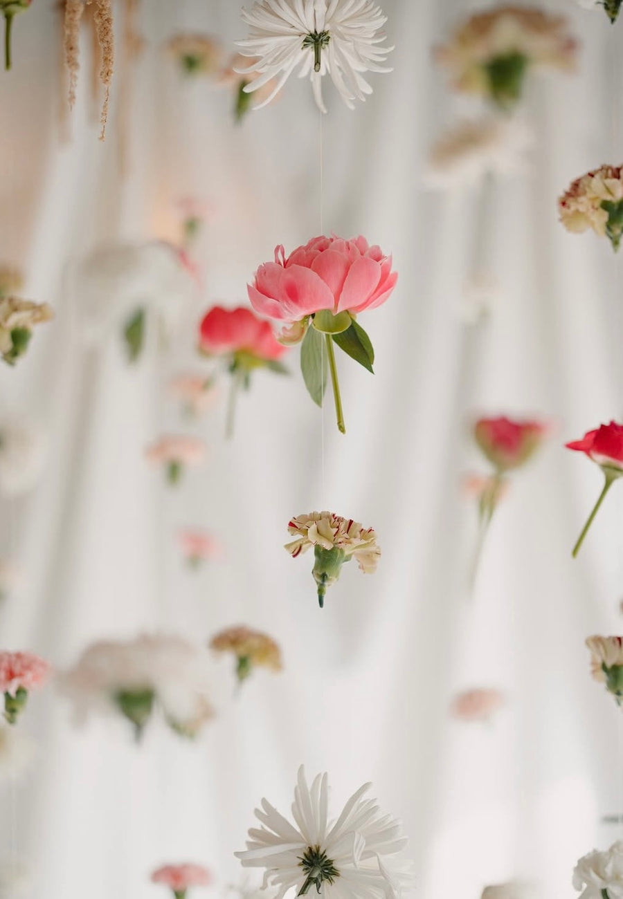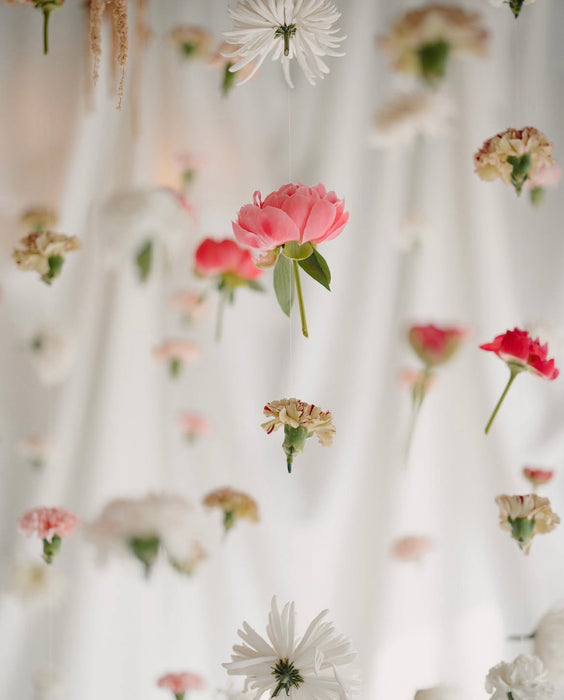 Pour incarner l’univers délicat de la collection Blanc Pivoine, POUSSE a imaginé une installation florale immersive : un vaste nuage de fleurs suspendu dans une pièce drapée de blanc. Cette scénographie aérienne jouait sur l’effet de flottement et d’apesanteur, plongeant les invités dans une atmosphère de rêve.