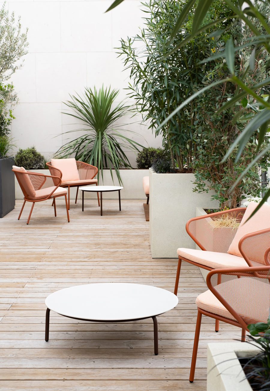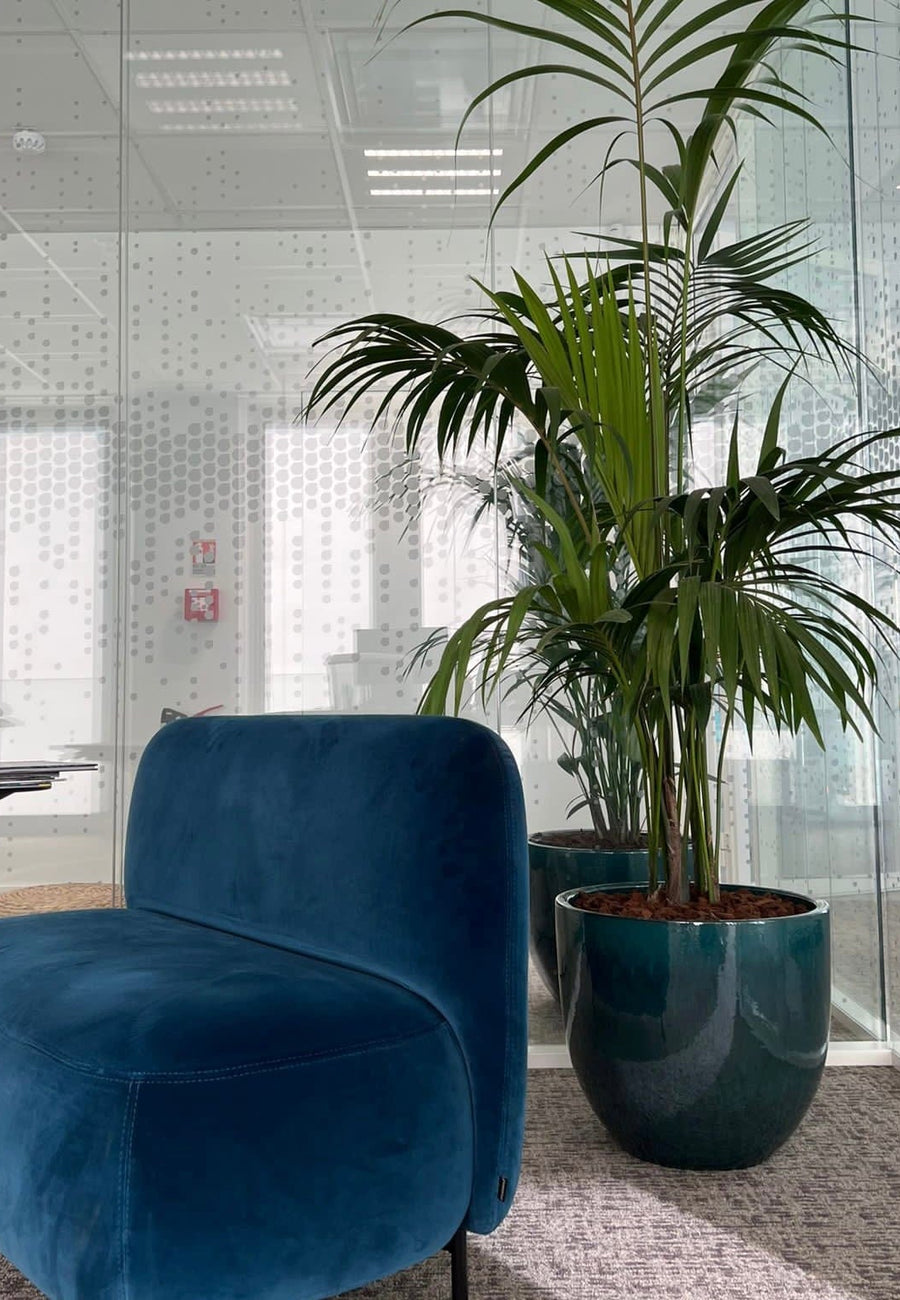 À l’intérieur, des pots en céramique colorés ont été disséminés le long des bureaux. Ils structurent les espaces de travail sans les cloisonner, tout en prolongeant l’ambiance naturelle du patio. Cette continuité végétale permet d’ancrer le végétal dans le quotidien, favorisant bien-être, concentration et sérénité.