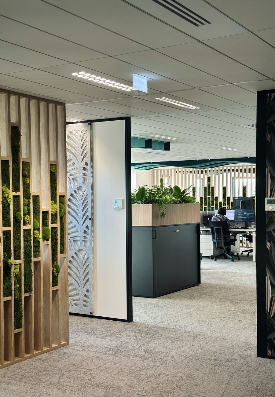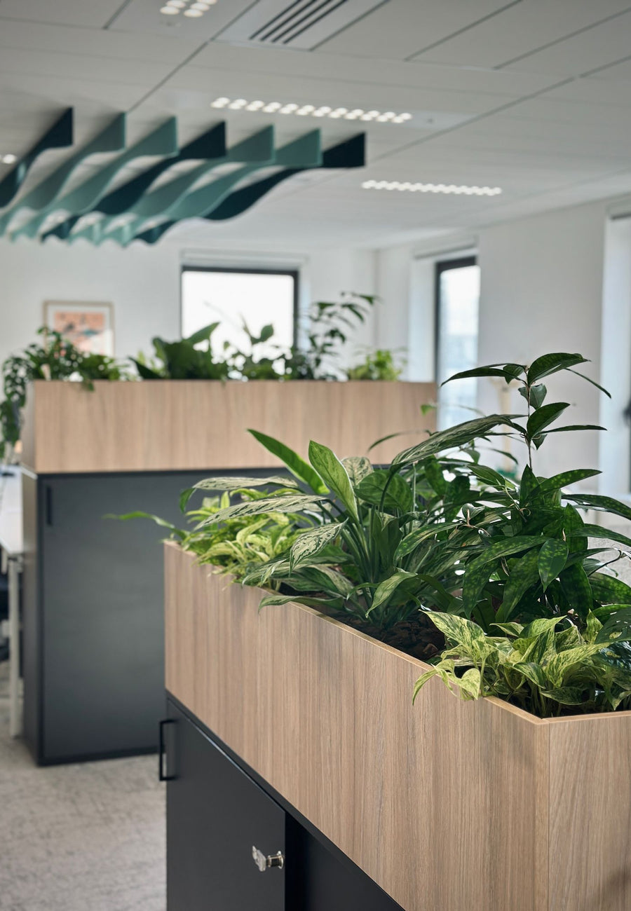 L’objectif était clair : introduire une présence végétale forte sans cloisonner l’espace ni altérer la luminosité naturelle. Le projet devait renforcer le confort visuel et le bien-être des collaborateurs tout en conservant la fluidité des déplacements.