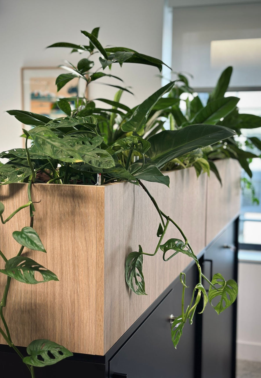 L’ensemble a été installé en hydroculture, un système qui facilite la gestion de l’arrosage tout en limitant le développement de nuisibles comme les moucherons. Résultat : un espace fluide, vivant et harmonieux, où la nature s’intègre pleinement au quotidien des équipes.
