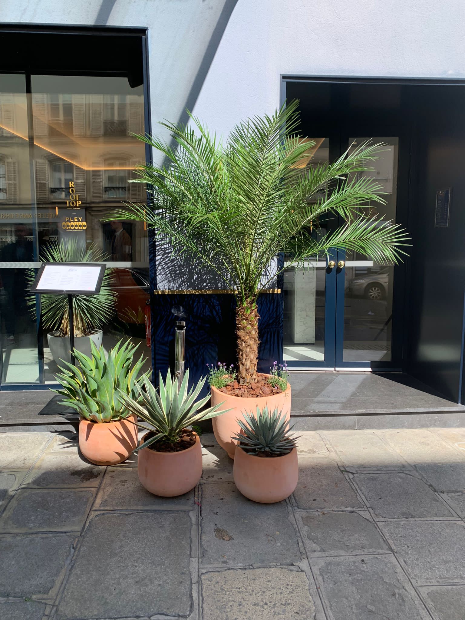 La composition végétale s’articule autour de palmiers phoenix et d’agaves, choisis pour leur allure graphique et leur capacité à évoquer un esprit “Palm Springs”. Cette combinaison apporte à la fois structure, élégance et exotisme discret, créant un effet de contraste raffiné avec l’environnement urbain.